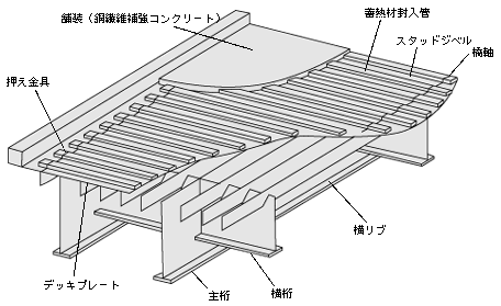 床版はデッキプレートにスタッドジベルを打ち、蓄熱材を封入した角パイプを並べ、おさえ金具で固定します。その上に熱伝導の良い珪石を用いた鋼繊維補強コンクリートを打設し、最後にアスファルト舗装をします。この床版構造は、デッキプレートと鋼繊維補強コンクリート(SFRC)がスタッドジベルを介して一体化された合成床版となります。